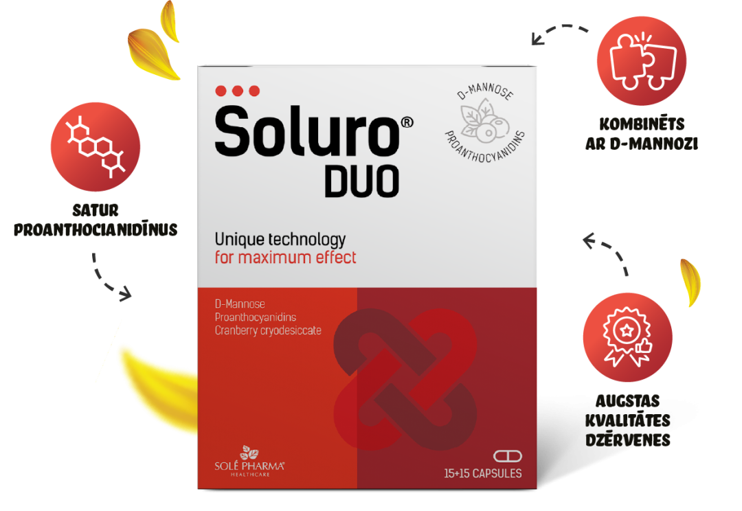Soluro® DUO maksimizē dabisko efektu un nodrošina dubultu iedarbību. Unikālais sastāvs nodrošina dabisku baktēriju izvadīšanu no urīnpūšļa.